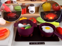 Po zasuku gumba se plošče osvetlijo, zaslišijo se realistični zvoki, iz gorilnika pa se sprošča varna para – skoraj kot pri pravem kuhanju.