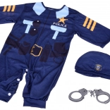 Prisrčen in realističen otroški policijski kostum za pustne zabave, karneval in igro doma. Set vključuje moder kombinezon s potiskom in čepico, ne manjkajo niti lisice za še več zabave. Zahvaljujoč enostavnemu oblačenju in udobnemu materialu bodo otroci uživali v obilo kreativne igre POLICE in lovljenja tatov.
