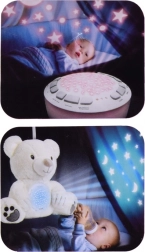 Ta mehak beli medvedek združuje igračo in nočno lučko v enem. Z 6 nežnimi uspavankami in 5 pristnimi zvoki narave pomaga umiriti malčka in vzbuditi občutek varnosti. Barvni projektor zvezd in lune na stenah in stropu ustvari pomirjujoče vzdušje, ki prežene temo in spodbuja miren spanec.