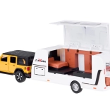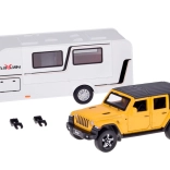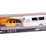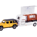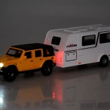 Set terenskega vozila in prikolice otrokom prinaša realistično igro potovanja in kampiranja. Kovinski model SUV v merilu 1:32 navduši z detajlno izdelavo, odpirajočimi se vrati in prtljažnikom ter predvsem z svetlečimi lučmi in zvoki motorja. Zahvaljujoč pull-back pogonu se avto po navijanju sam zapodi naprej.