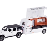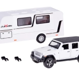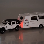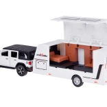 Odkrijte počitniške avanture z realističnim setom – terensko vozilo s prikolico v merilu 1:32. Kovinska karoserija, svetlobni učinki, zvok motorja in hupa, odpirajoča se vrata in prtljažnik ter pull-back pogon za zabavno vožnjo. Prikolica ima odpirajoče se stranice in notranjost s mizico, stoli in posteljo, zato je igra še bolj realistična.