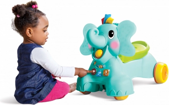 Interaktivna plošča z lučkami, gumbi s številkami in melodijami prebuja čute in uči povezav, medtem ko mehka ušesa z masažnimi izboklinami služijo kot varna grizala. Slonov rilec na zabaven način pobira raztresene žogice in jih vrača v sprednjo košaro ali na tla; dodatne žogice lahko shranite v prostor pod sedežem. Za brezskrbnost staršev in otrokovo stabilnost je mogoče uravnavati hitrost koles.