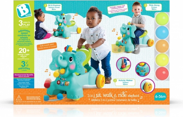 Slonov rilček na zabaven način pobira barvne žogice in jih izstreljuje v košaro ali na tla, zato se otrok uči vzroka in posledice ter koordinacije. Žogice lahko pospravite v shranjevalni prostor pod sedežem; hitrost koles je mogoče preprosto nastaviti za bolj stabilno vožnjo.