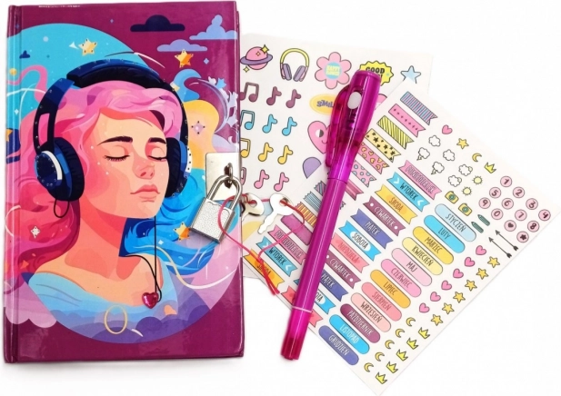 Magični svetlobni glasbeni dnevnik vsebuje 40 črtastih strani. Ima trde platnice, okrašene z LED-lučkami, in zapiranje z obešanko. Priložena sta 2 lista nalepk ter pisalo z dvema konicama. Ena vsebuje običajen črnilo, druga nevidno črnilo, ki je vidno le s pomočjo posebne "svetilke" na pisalu.