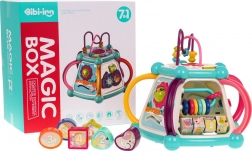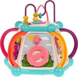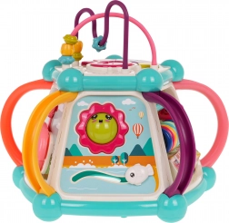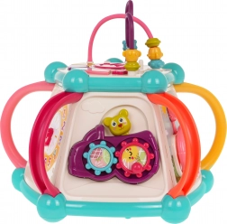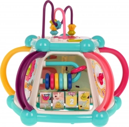 Ta barvita multifunkcionalna kocka je izdelana iz kakovostne, varne plastike in je idealna za prvo raziskovanje sveta. Sedem igralnih ploskev ponuja raznolike aktivnosti: zgornja plošča s sestavljanko, dvostopenjskim uravnavanjem glasnosti in klavirčkom z zvoki kužka, mucke, ovčke in račke, stranske ploskve s števcem, uro s kazalcema, zobniki in medvedkom, volančkom z avtomobilčkom ter zabavno ribico s sončkom. Spodnja stran skriva odprtino za razvrščanje oblik in 6 barvnih kock.