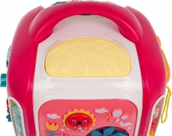 Igrača je izdelana iz kakovostne plastike v živih barvah, ponuja bogate zvočne učinke (melodije, pesmice, zvoki živali in vozil, štetje, klikanje prenosov) in svetlobne učinke (osvetljen boben in tipke). Stranski loki z vrtljivimi elementi krepijo spretnost prstkov in spodbujajo otroško radovednost.