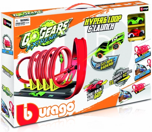 Doživite adrenalinsko vožnjo z avtocesto Bburago GoGears Extreme! Sistem s 6 zankami, skakalno rampo in 2 izjemno hitrima avtomobilčkoma ponuja akcijo, ki bo navdušila male in velike dirkače. Z enim navijanjem avtomobilček prevozi do 25 m, za zabavo pa poskrbi tudi papirnata tarča z točkovanimi conami.
