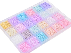 Vsebuje 24 različnih pastelnih barv kroglic: rožnate, vijolične, modre, bež, zelene, bele in rumene. Shranjene so v prozornem, podolgovatem etuiju, ki je praktično razdeljen na predelke. Tako se prepreči mešanje kroglic in olajša njihova organizacija.