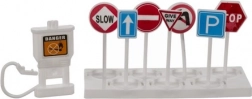 V kompletu je podrobna podloga z načrtom mesta, prometni znaki, 2 avtomobilčka in helikopter – pripravljeno za takojšnjo igro.