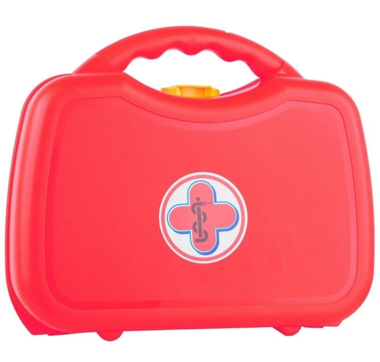 Komplet v kovčku vsebuje osnovno, nujno opremo za vsakega malega zdravstvenika. Rdeč kovček je izdelan iz zelo odporne plastike, ima udoben ročaj za prenašanje in rumen zatič proti nenamernemu odpiranju. Ta manjši komplet vsebuje do 13 kosov. Vsi so seveda varni za otroke in enostavni za uporabo. Kovček vključuje rdeč in temno moder plastični stetoskop, plastične škarje, pinceto, injekcijsko brizgo, termometer, otoskop, kladivce, škatlico z vatnimi tamponi, obliž, pinceto in beležko. Vsi predmeti so seveda varni za otroke in enostavni za uporabo. Nabor zdravniških kompletov in dodatkov je po eni strani namenjen igri zdravnika ali medicinske sestre, po drugi pa pomaga otrokom, da se privadijo temi obiska pri zdravniku, opravljanja pregledov in posegov. Na voljo je široka paleta kompletov z večjo ali manjšo količino dodatkov ter tudi vrsta posameznih izdelkov, kot so zdravniški plašči in stetoskopi. Celotna linija je vizualno zasnovana tako, da je primerna za igro tako fantov kot deklet.