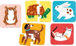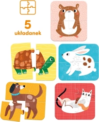 Te zabavne sestavljanke otroke seznanijo z znanimi domačimi ljubljenčki. Vsaka štiridelna sestavljanka predstavlja žival, kar spodbuja fino motoriko in zaznavanje.