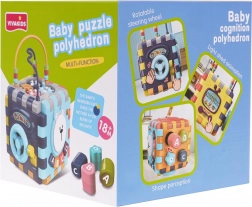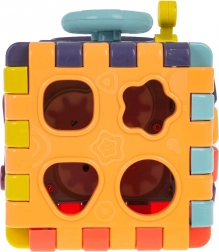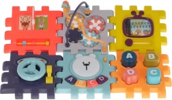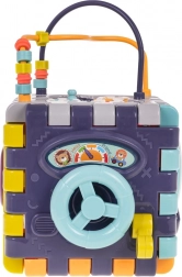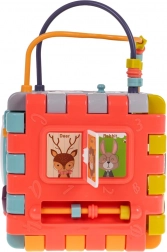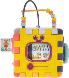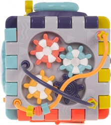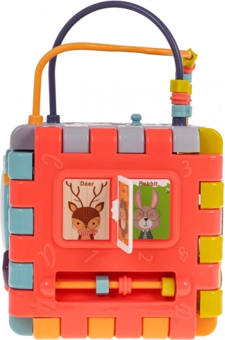 Zgornji del prinaša zobnike in kroglice za urjenje koordinacije oko–roka. Sortirnik oblik s 4 barvnimi kockami podpira prepoznavanje oblik in logično razmišljanje. Kocka je izdelana iz trpežne plastike v živih barvah in s svojo zasnovo spodbuja raziskovanje ter samostojno igro.