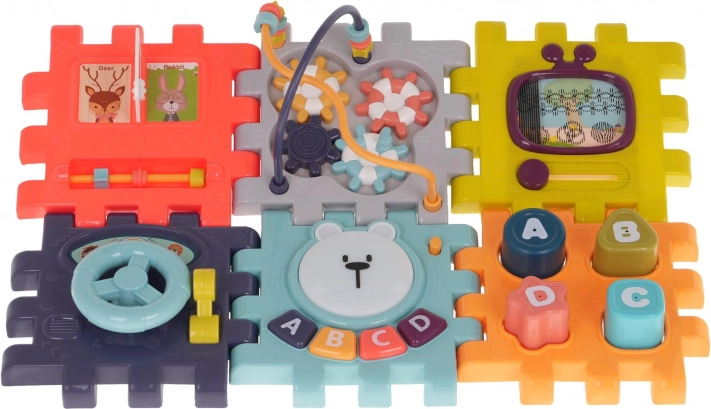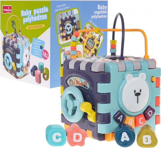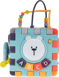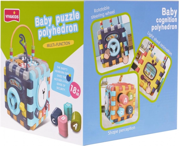Ta pametna otroška kocka se zlahka razpre “na ravno”, zato se lahko otrok zabava s posameznimi paneli ločeno. Interaktivna stran z medvedkom pritegne z svetlečo glavo in gumbi A, B, C, D, ki predvajajo melodije in učijo črke v angleščini. Ne manjka volan s “prestavno ročico”, drsniki, vrtljivi elementi in majhna vrtljiva knjižica.