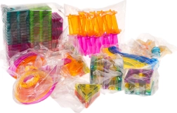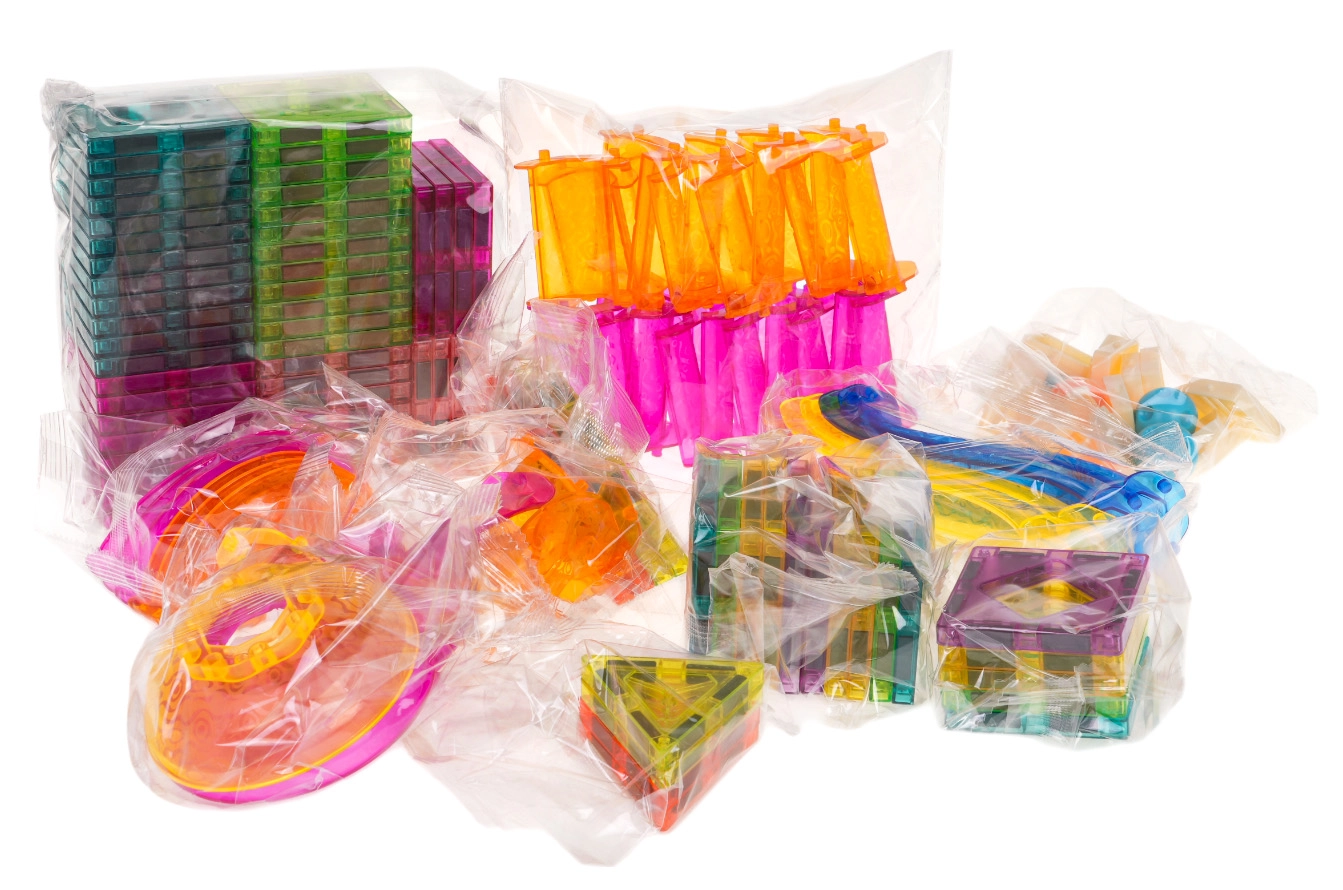 - 139 konstrukcijskih delov (vključno z 71 magnetnimi), 6 kroglic, dekorativne nalepke, slikovni priročnik, škatla z razvrščevalnikom in ročajem
