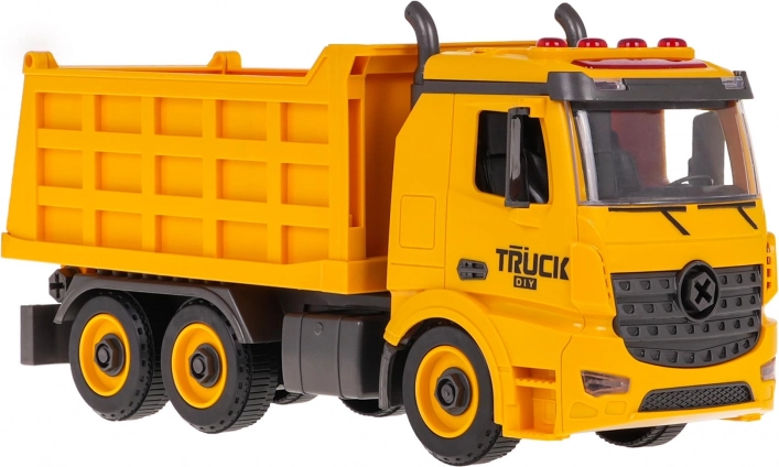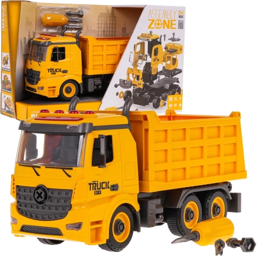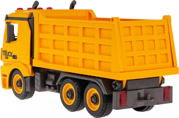 Praktične funkcije vključujejo dvižno in spuščajoče korito z odprtljivim zadnjim delom ter možnost snema priklopnika/korita s podvozja. Na kabini najdete utripajoče luči in nadzorne gumbe za zvoke zagona, vzvratne vožnje, hupa in alarm. Igrača je pripravljena za uporabo takoj po razpakiranju – baterije so priložene.