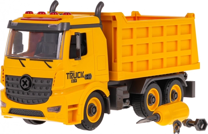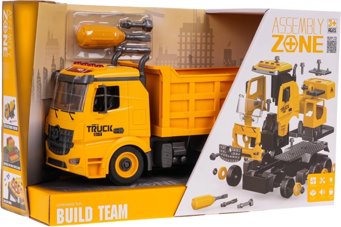Zabavna in poučna igrača za male graditelje: razstavljivi tovornjak-kipar za otroke od 3 let s svetlobnimi in zvočnimi učinki. Priložen je izvijač z zamenljivimi nastavki, s katerim otrok vadi fino motoriko in razume principe sestavljanja. Kiparsko korito ima pogonska sprednja kolesa, dvižno korito z odprtljivim zadnjim delom in na strehi utripajoče lučke ter funkcijske gumbe za zvoke zagona, vzvratne vožnje, hupa in alarm. Baterije 3× AG13 so priložene v paketu.