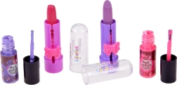 Glossi, šminke, laki, paletka senčil z aplikatorjem in samolepilne konice – vse usklajeno v igrivih rožnato‑vijoličnih tonih.