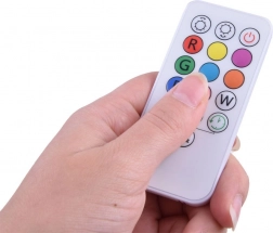 Del kompleta je praktičen daljinski upravljalnik za vklop/izklop, menjavo barv, zatemnjevanje in nastavitev časovnika (15/30/60 min). Ne manjkajo učinki počasne/hitre menjave barv, utripanja in »dihanja« z nežnim prehajanjem barv. Vgrajena baterija zagotavlja približno 30 ur svetljenja, popolnoma se napolni v približno 4 urah.
