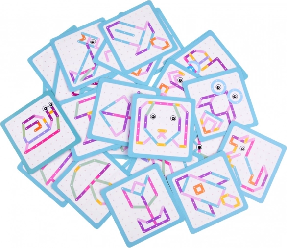 V kompletu je 28 pisanih kartic z vzorci. Otroci postopoma posnemajo like, se učijo načrtovanja in pridobivajo samozavest pri sestavljanju.