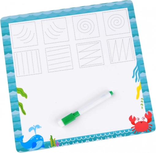 Ta pametni komplet združuje mozaično pegboard tablo z barvnimi lesenimi paličicami in suho brisljivo pisalno površino. Na eni strani otroci vstavljajo paličice različnih dolžin in barv v lesene čepke ter ustvarjajo slike po karticah ali lastne motive. Na drugi strani table lahko vadijo grafomotoriko, pisanje in prve risbe s priloženim suho brisljivim flomastrom.
