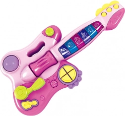 Kitara je opremljena z 9 gumbi, ki sprožijo različne melodije in zvoke ter ponuja 3 glasbene režime - pop, rock in blues. Svetleči gumbi, gibljivi valj in rožnata ročica za menjavo skladb prinašajo dinamično zabavo, medtem ko razširitvena kroglica služi kot ropotuljica.