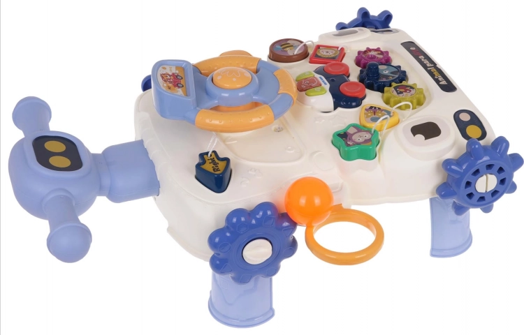 Volan s piščalko, zobniki, vstavljanje oblik in mini košek razvijajo fino motoriko, koordinacijo in logično razmišljanje.