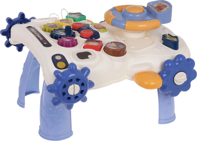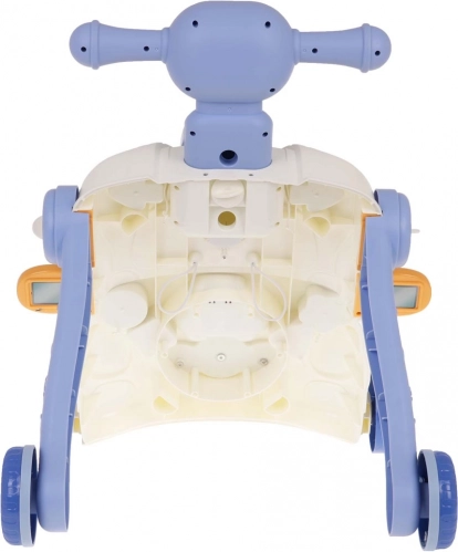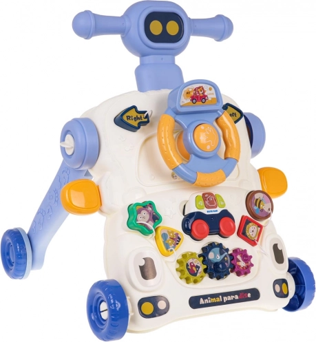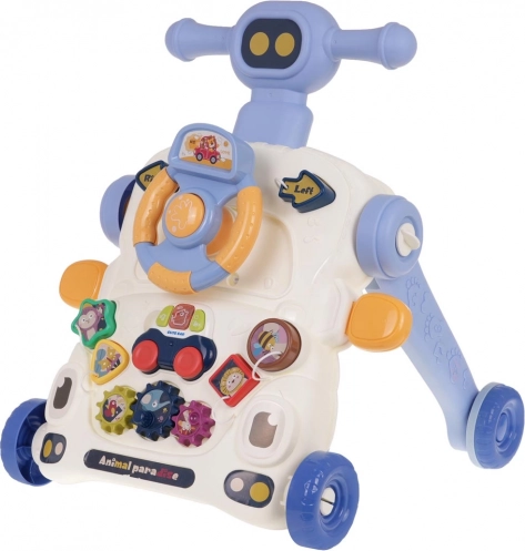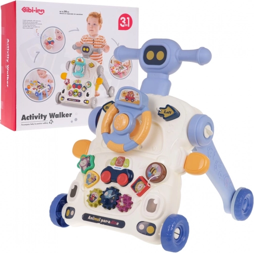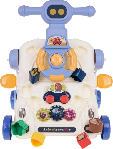 Odstranljivo interaktivno avtece prinaša svetlobne in zvočne učinke (melodije, zagon motorja, vožnja, otroški smeh, zvončki), ki motivirajo k raziskovanju. Zahvaljujoč dvostopenjsko nastavljivemu ročaju in gumijastim kolescem je gibanje gladko in varno. Pretvorba v mizico je hitra in preprosta – idealno za igro v sedečem položaju.