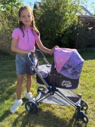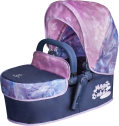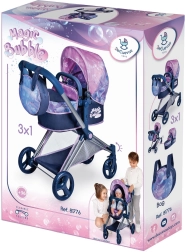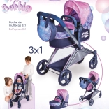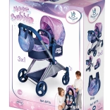 Stilni voziček za lutke 3 v 1 iz kolekcije Magic Bubble navduši z realistično zasnovo, enostavnim zlaganjem in bogatimi dodatki. Ponuja odstranljivo globoko košaro, ki jo lahko spremenite v športni sedež, nastavljivo strehico, tritočkovni pas za varno namestitev lutke in vrtljiva sprednja kolesa za gladko vožnjo. Ne manjkata praktična košara in okrogla torba v nežnem mavričnem dizajnu.