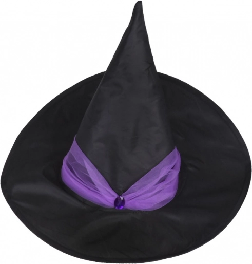 Klasičen črn klobuk z vijoličnim okrasjem popolno dopolni kostum in poudari čarovniško vzdušje.