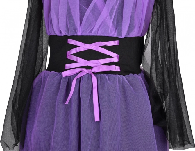 Spremenite svojo malo damo v skrivnostno čarovnico. Obleka v kombinaciji črne in vijolične barve z zračno plastjo tila in dekorativnim vezanjem na life ustvarja izrazit, a še vedno udoben kostum. Lahek tekstil je prijeten za nošenje in ne omejuje gibanja, zato je odlična izbira za celovečerno zabavo.