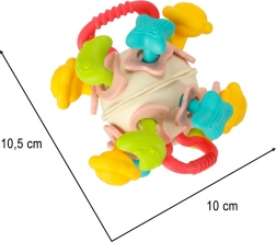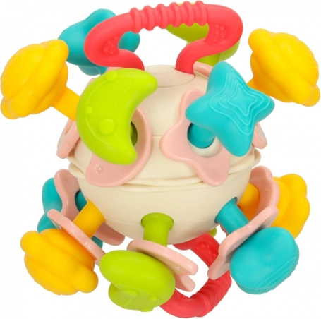 Ta lahka in enostavno oprijemljiva senzorična igrača združuje plastične in silikonske elemente, ki otroke spodbujajo k raziskovanju. Kontrastne barve in več vrst površin podpirajo vidno in tipno stimulacijo, medtem ko nežen rožljajoč zvok razvija slušno zaznavanje.