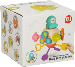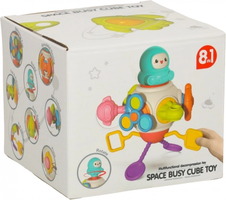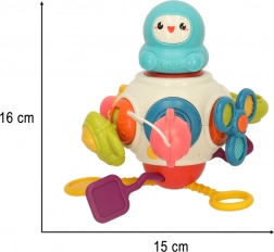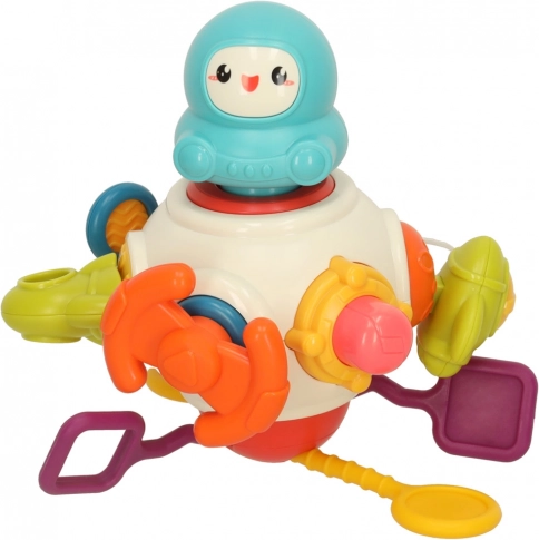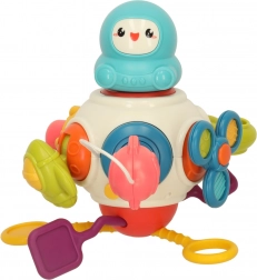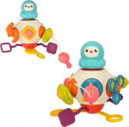 Ta vsestranska senzorična igrača z ljubko figurico ponuja otrokom veliko načinov za odkrivanje sveta dotikov, barv in gibanja. Zaradi različnih tekstur, vrtečih, drsnih in stiskalnih elementov si otroci urijo koordinacijo oko–roka in krepijo prstke. Mehki silikonski deli hkrati delujejo kot varno grizalo, ki pomaga pomiriti razdražene dlesni.