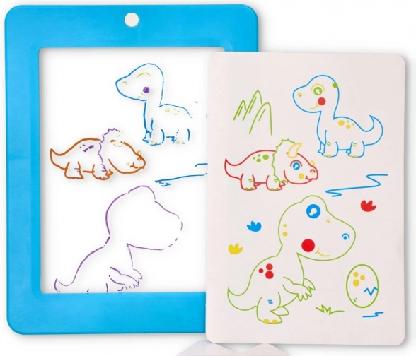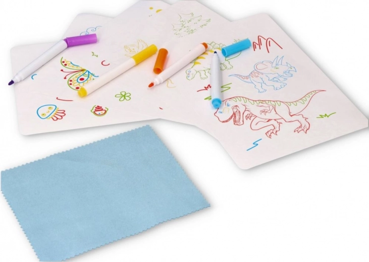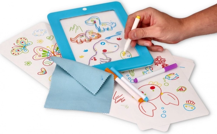 S priloženimi šablonami (dinozavri, živali, vesolje) in mikrovlakneno krpo otroci zlahka obrišejo, pobarvajo in tablo hitro očistijo – zabava znova in znova.