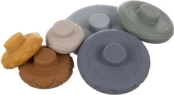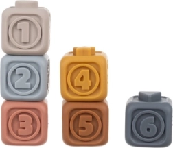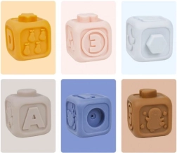 Na voljo je 6 mehkih kock in obročkov, ki oddajajo nežne zvoke in imajo različne teksture, kar spodbuja razvoj čutil in motoričnih spretnosti.