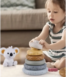 Poleg 13 senzoričnih miz in kock, set vključuje tudi ljubko igračko v obliki koale, ki jo lahko namestite na kocke, kar povečuje zabavo. Vsak element seta je zasnovan tako, da otrok dobi raznolike senzorične in zvočne dražljaje po zaslugi izbočenih vzorcev in nežnih zvokov, ki jih kocke ob manipulaciji sprožijo.
