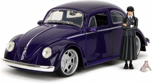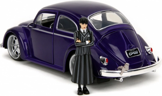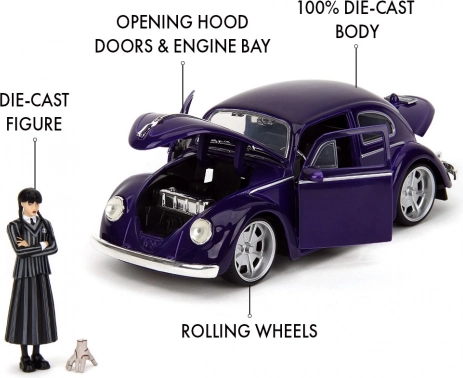 Uradno licenciran zbirateljski set podjetja Jada Toys prinaša ikonični Volkswagen Beetle (1972) v merilu 1:24 in figurico Wednesday Addams vključno z Rokico (Thing). Kovinska izdelava z odpirajočimi se vrati, pokrovom motorja in prtljažnikom, gumijastimi kolesi ter natančnimi detajli zagotavlja odlično izkušnjo pri razstavljanju in igranju. Idealno za občudovalce serije Wednesday in zbiratelje od 8 let dalje.