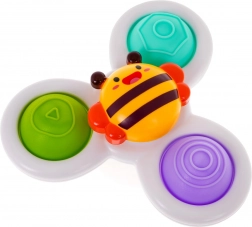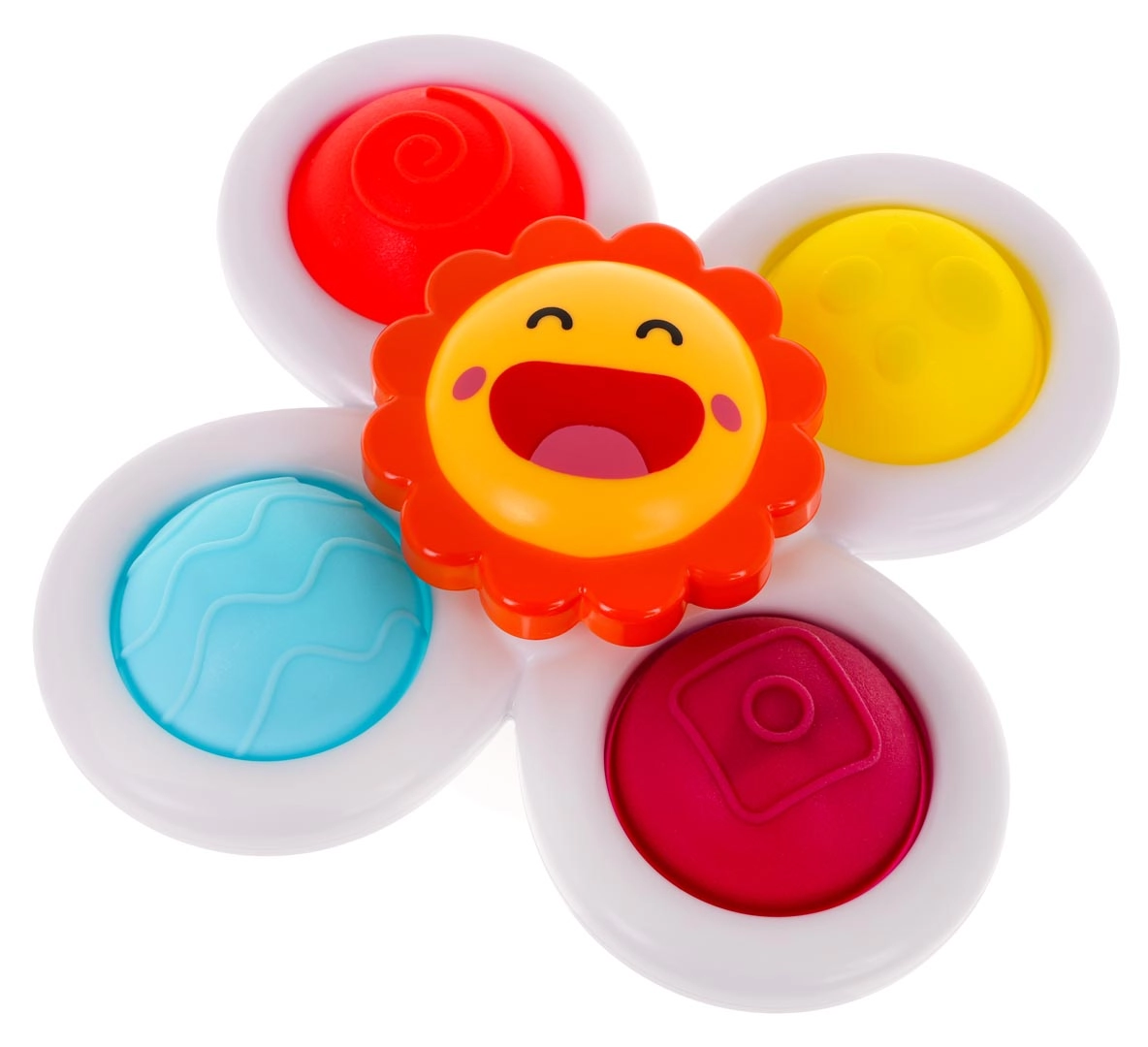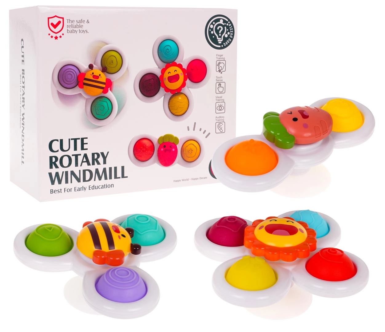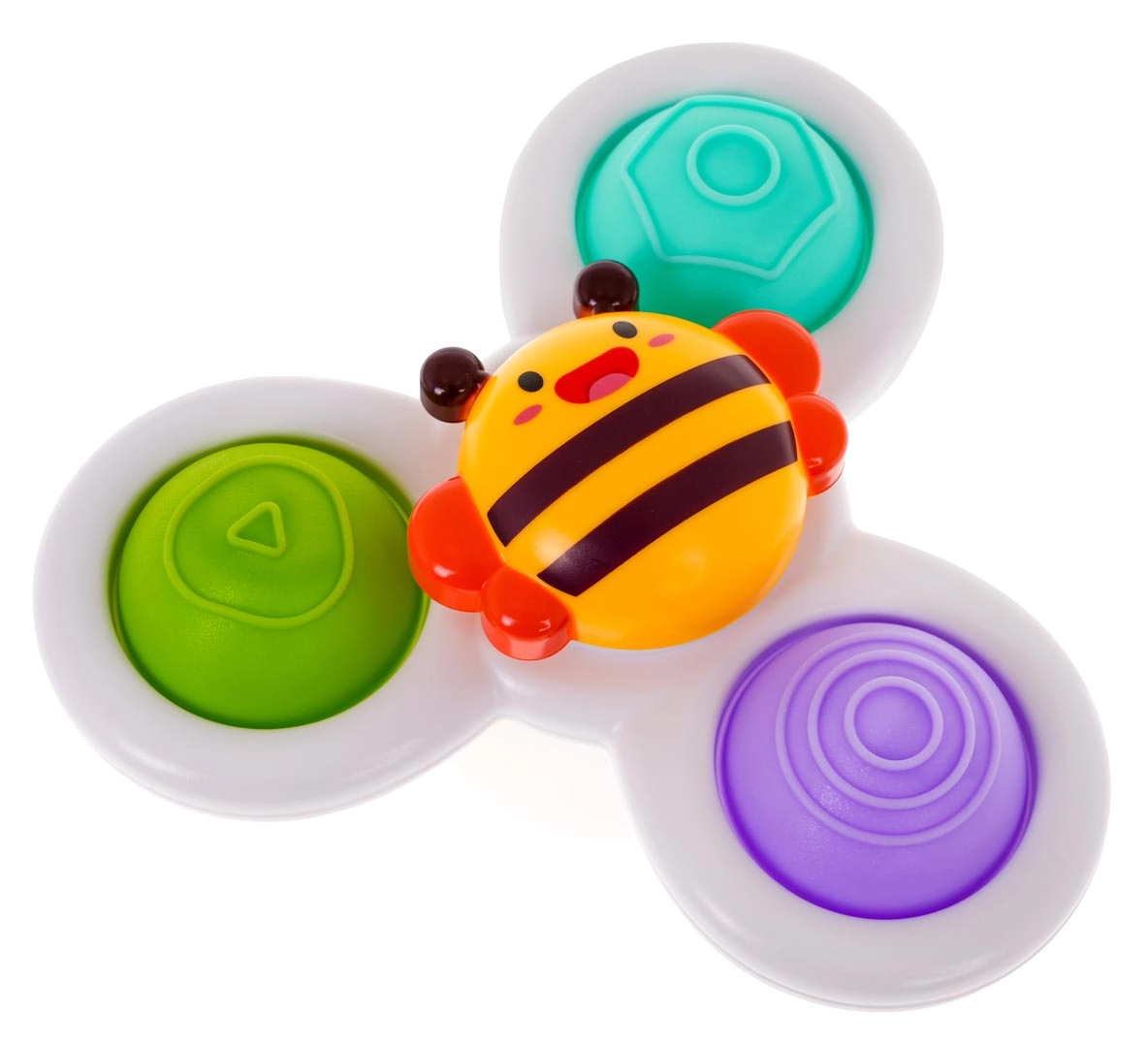 Tri prisrčni motivi – sonček, čebelica in korenček – povezujejo igriv dizajn s praktičnimi funkcijami za otrokov razvoj. Močan prisesek na zadnji strani omogoča pritrditev igrače na različne gladke površine, medtem ko vzdržljivi ležaji zagotavljajo dolgotrajno in gladko vrtenje. Zaradi vodoodporne izvedbe so vrtečki odlični tudi za kopel.