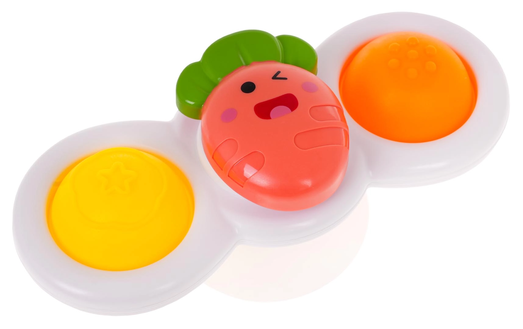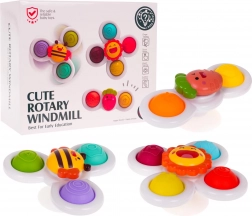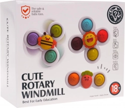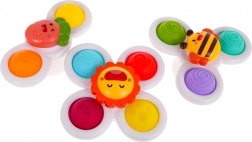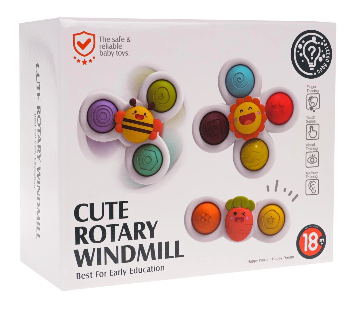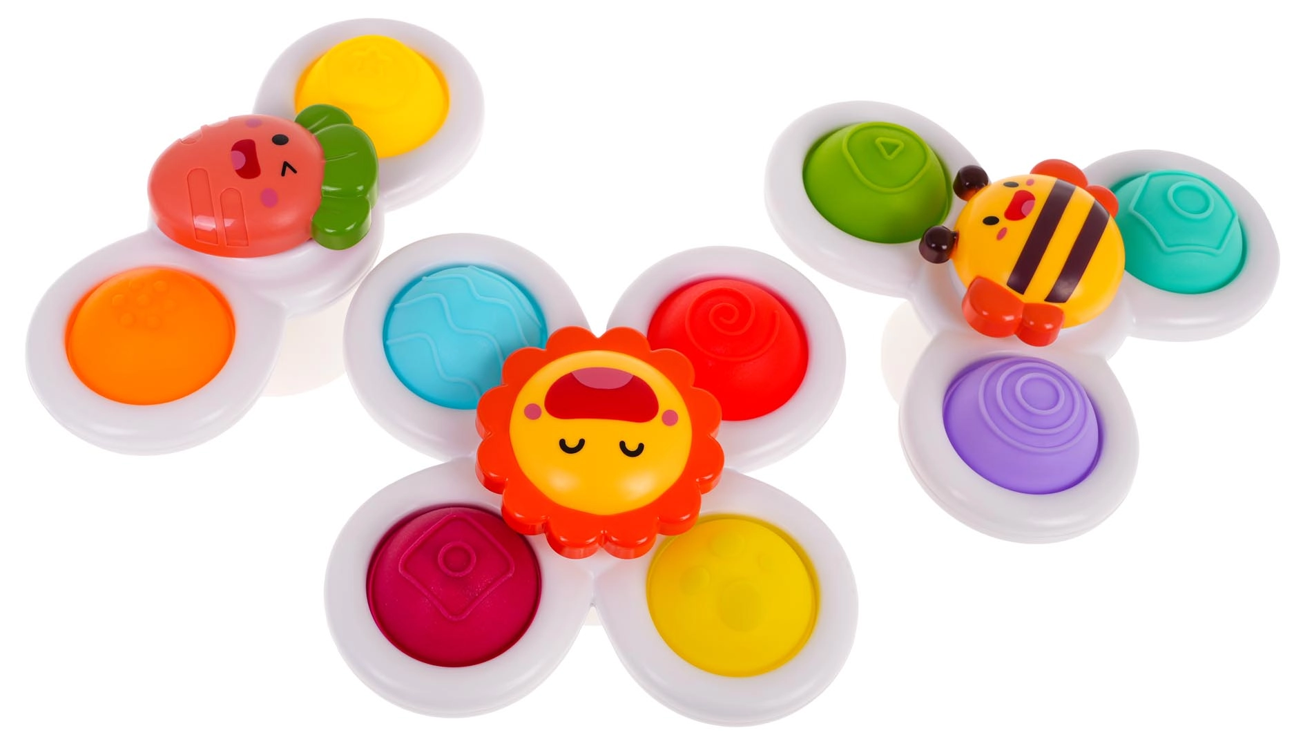 Tri prisrčni motivi – sonček, čebelica in korenček – povezujejo igriv dizajn s praktičnimi funkcijami za otrokov razvoj. Močan prisesek na zadnji strani omogoča pritrditev igrače na različne gladke površine, medtem ko vzdržljivi ležaji zagotavljajo dolgotrajno in gladko vrtenje. Zaradi vodoodporne izvedbe so vrtečki odlični tudi za kopel.