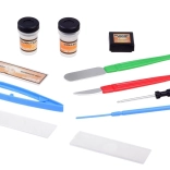 - Pripravljeno stekelce, 2× predmetno stekelce, 2× lonček s pokrovčkom, škatlica za vzorce, pinceta, lopatica, skalpel, igla, izvijač, navodila