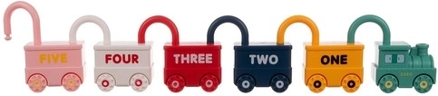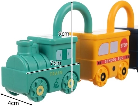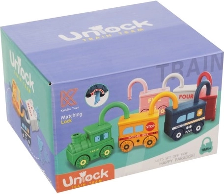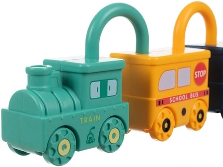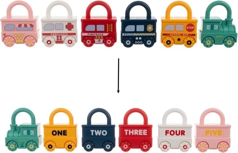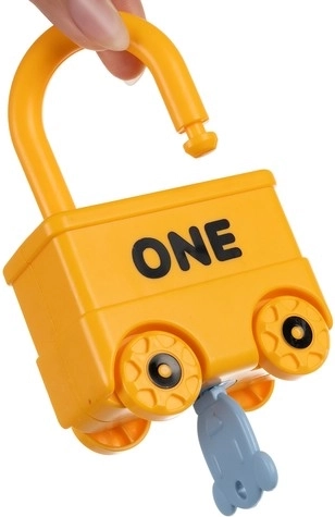 Ta pametna izobraževalna igrača združuje zabavo s smiselnim učenjem. Vsako vozilo je ključavnica in k vsakemu sodi en ključek v obliki medvedka z vtisnjeno številko 0–5. Otrok tako naravno vadi fino motoriko, logično razmišljanje in prepoznavanje števil. Zgornji del ključavnice se lahko vrti za 360°, po pravilnem odklenitju se vozila zlahka povežejo v dolg vlak.