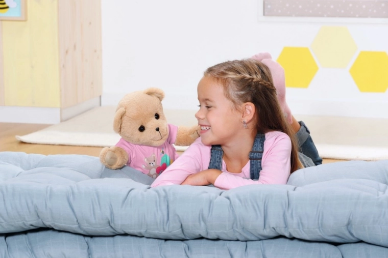 Premične okončine in vrtljiva glavica olajšajo oblačenje in omogočajo stilno poziranje. Medvedek je zato odličen sopotnik za domišljijsko igro – lahko je dojenček, prijatelj, princesa ali pogumni popotnik. Priložena je tudi knjižica prijateljstva z nalepkami, kamor si otroci lahko zapisujejo skupne dogodivščine.