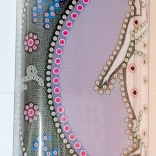 Postopek: Platno je prekrito z lepilom in zaščiteno s prozorno folijo. Folijo odstranjujte postopoma, da ohranite lepljivost. Kamenčke nameščajte na znake, ki ustrezajo številkam na vrečkah s kamenčki. Nadaljujte barvo za barvo za najboljši učinek.