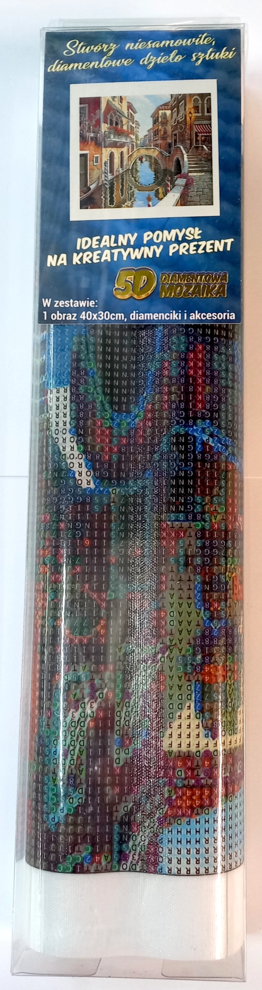 Vsebina pakiranja: platno s predtiskano sliko, pero za nanašanje kamenčkov, posodica za stresanje kamenčkov, vosek za lepljenje, komplet barvnih kamenčkov.