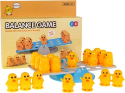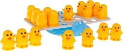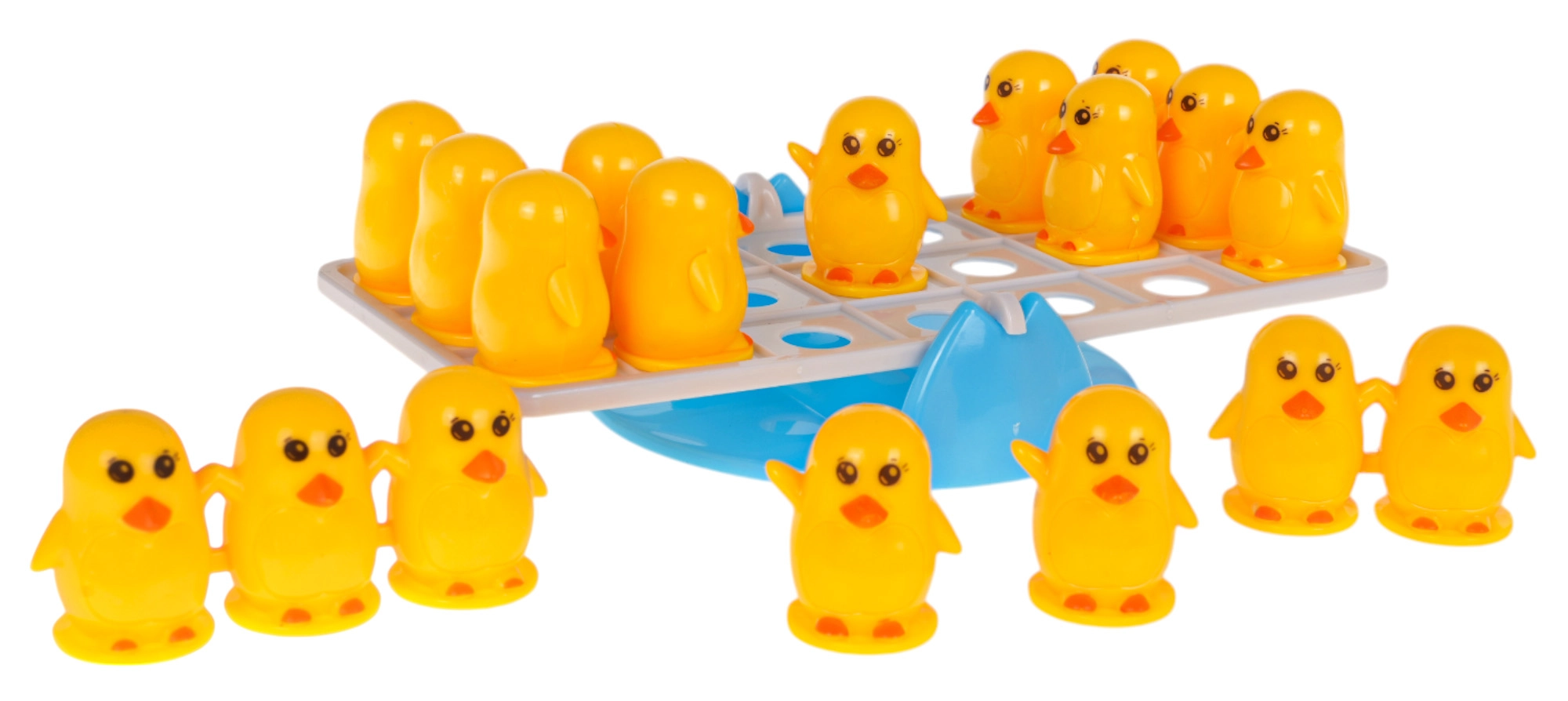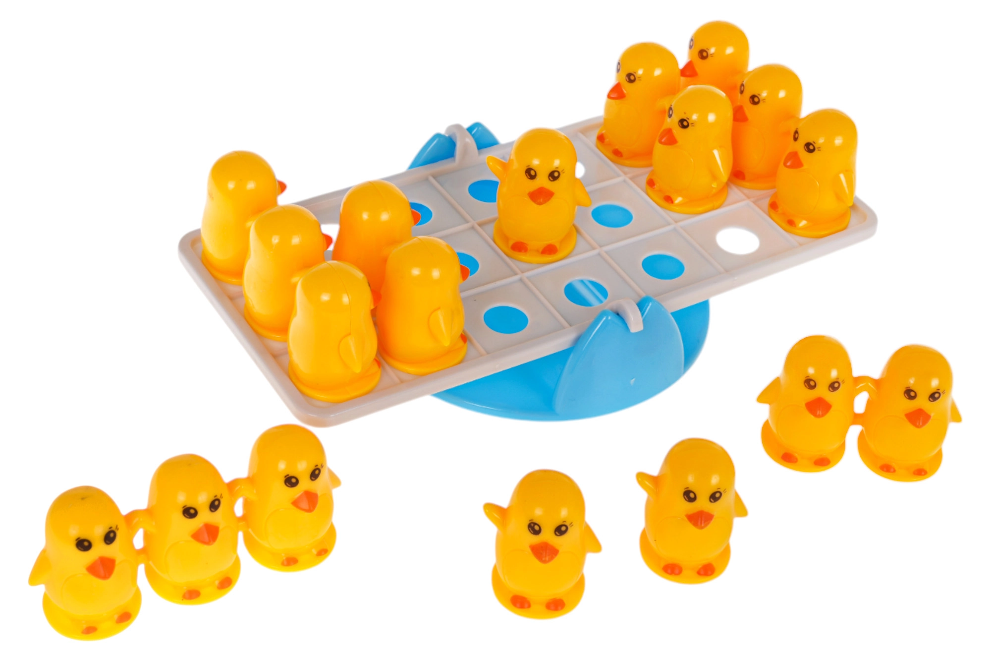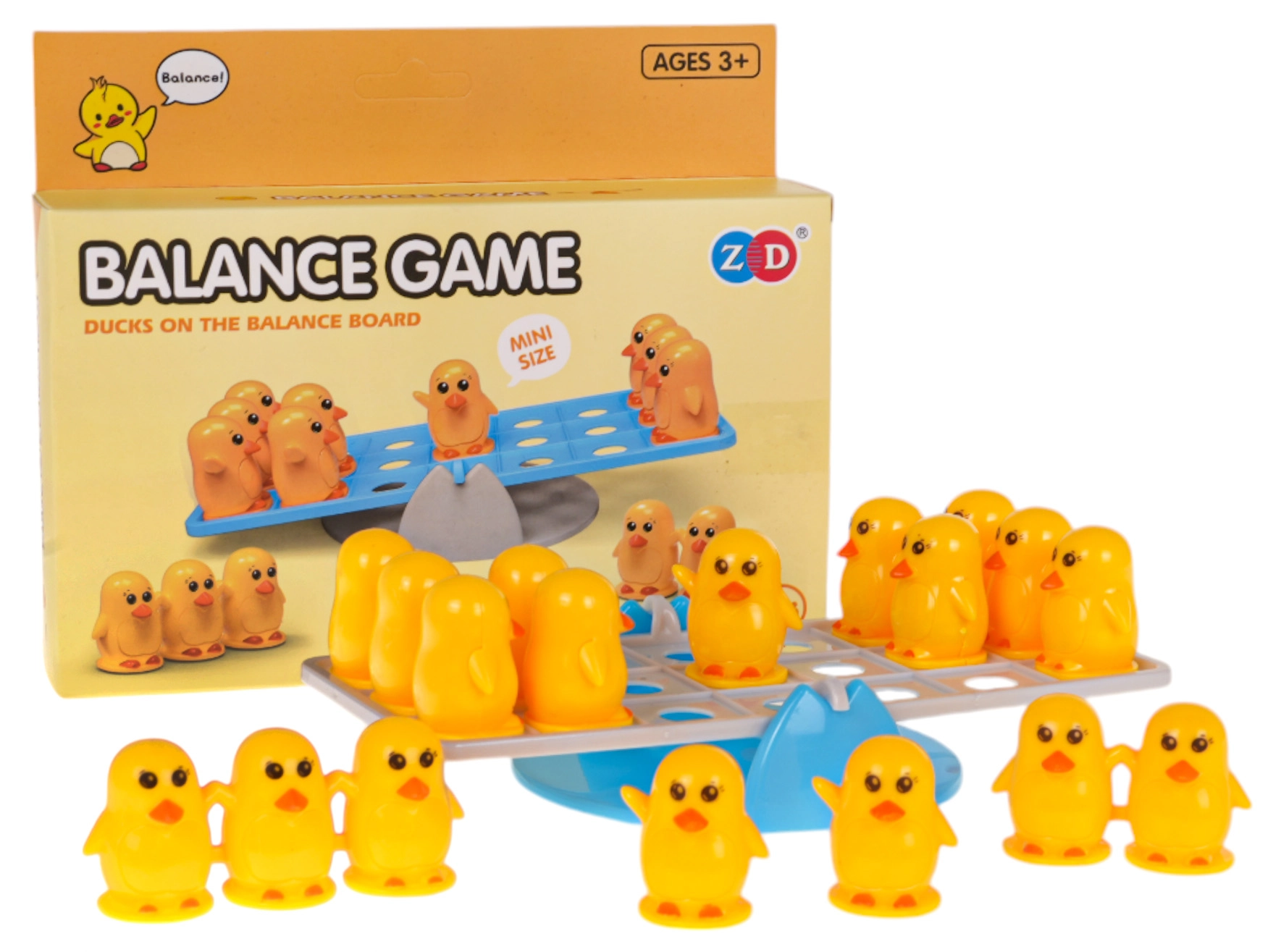 Ta ravnotežna igra z račkami spodbuja otroško domišljijo in uri fino motoriko. Naloga je polagati figure rac na obe strani podstavka tako, da se ohrani ravnotežje. Otroci se naravno učijo primerjave teže, seštevanja in odštevanja ter razumejo preprosta fizikalna načela.