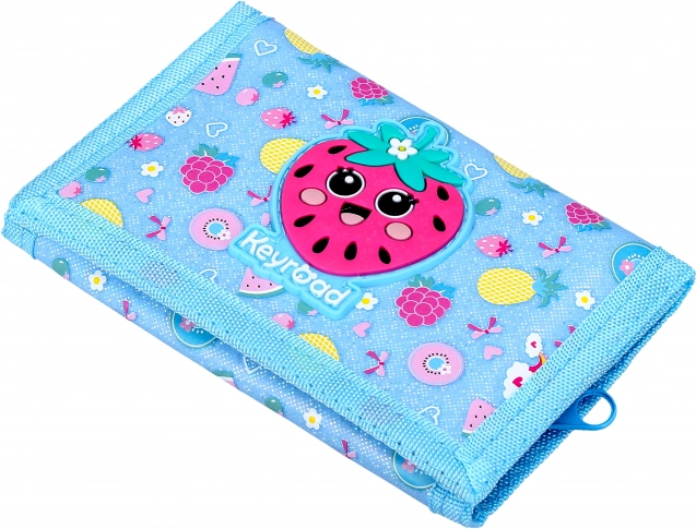 Stilska dekliška denarnica Keyroad iz trpežne tkanine navduši s pisanimi motivi in praktično zasnovo. Ima zanesljivo zapiranje na ježka, kompaktne mere za otroške roke in je na voljo v 3 veselih dizajnih – jagoda, krof in zajček.