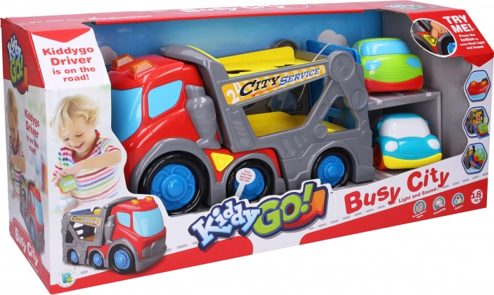 S tem vlečnim kompletom Kiddy bodo otroci doživeli veliko realistične zabave. Vlečno vozilo z dvema ploščadema in nagibno rampo omogoča enostavno nakladanje priloženih avtomobilčkov, medtem ko svetlobni in zvočni učinki igri dodajo pristno vzdušje. Zahvaljujoč prostim kolesom se vozila gladko premikajo po tleh.