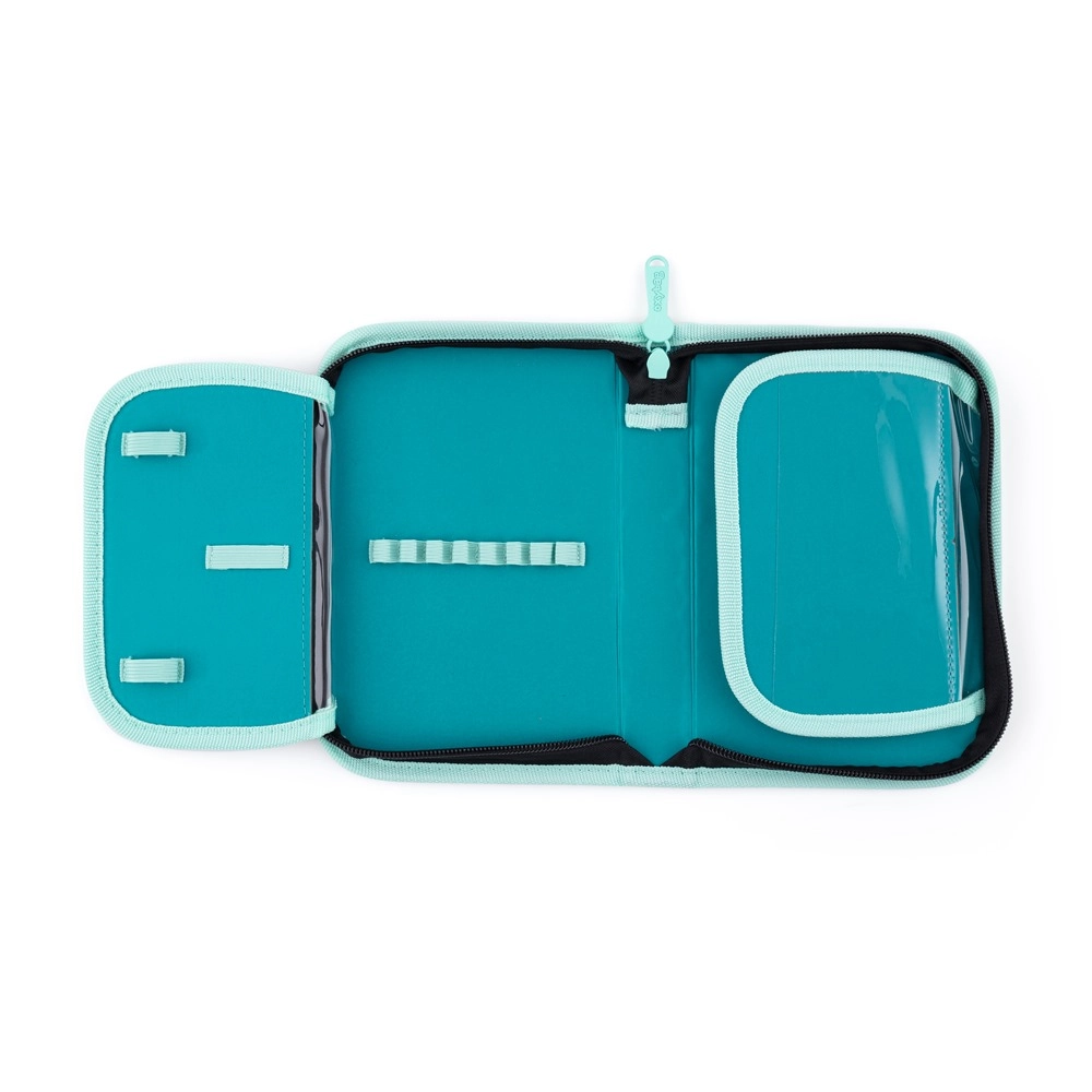 Enonadstropna šolska peresnica z 2 zavihkoma, prazna, vsebuje 25 elastičnih zank za pritrditev pisal. Na notranjih zavihkih so prozorne folije za urnik.