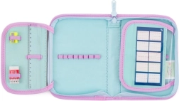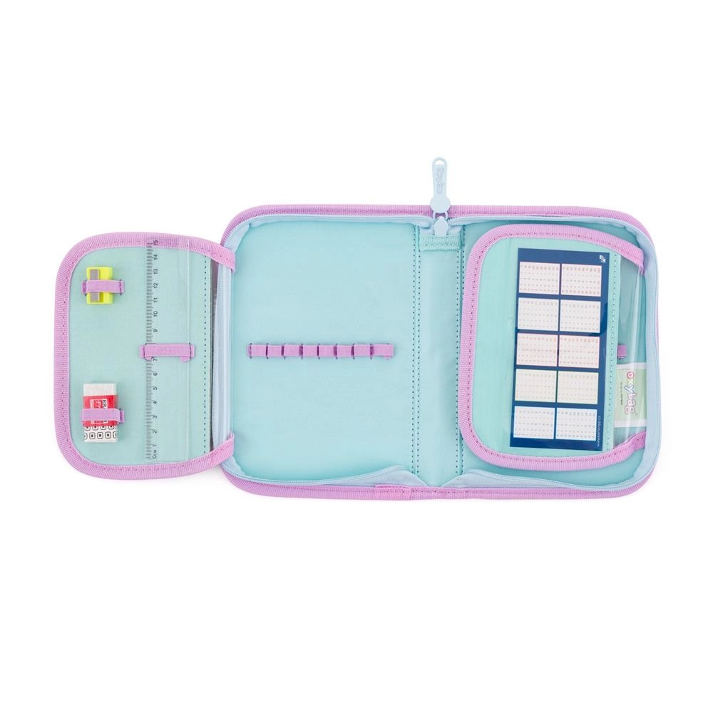 Enonadstropna šolska peresnica z 2 zavihkoma, prazna, vsebuje 25 gumijastih zank za pritrditev pisal. Na notranjih zavihkih so prozorne folije za urnik.