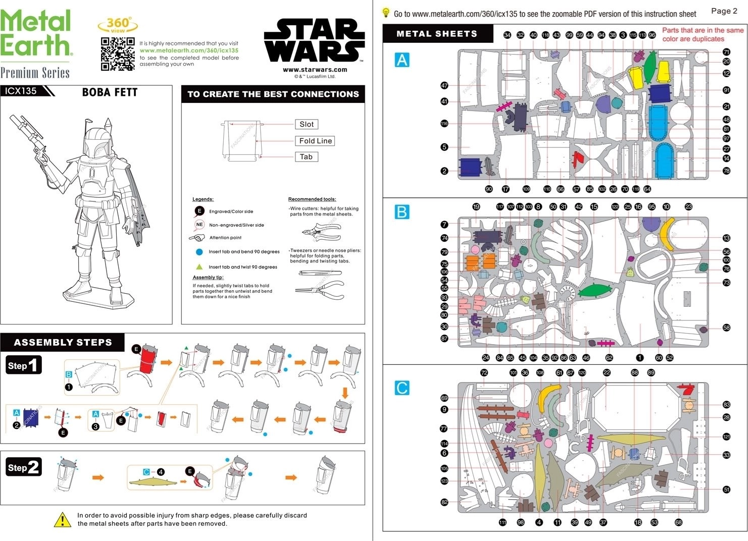 Vznemirljiv izziv, užitek pri sestavljanju in osupljiv rezultat – to so modeli METAL EARTH! Model iz premium linije Star Wars ICONX v ekskluzivni darilni embalaži vas bo očaral z še dovršeneje obdelanimi detajli! Sestavljanje 3D sestavljanke METAL EARTH ICONX zahteva potrpežljivost in spretne roke. Končni rezultat pa v celoti poplača vložen trud! Miniaturne replike so še posebej impresivna in privlačna dekoracija ne le doma, temveč tudi v pisarni ali šoli. Iz pravokotnih jeklenih ploščic z deli svetovnih znamenitosti, slavnih prevoznih sredstev, glasbil ali živali bodo pod vašimi rokami nastali podrobno izdelani, fascinantni modeli. Avtentičen videz 3D sestavljank METAL EARTH ICONX je dosežen z natančnim laserskim graviranjem. Pakiranje vsebuje 3 jeklene ploščice s predrezanimi deli, pinceto in navodila za sestavljanje. Orodje – klešče niso priložene. POSTOPEK DELA: Posamezne dele odstranite iz kovinskih ploščic; po potrebi uporabite majhne strižne škarje (niso priložene). Deli se med seboj povezujejo s pomočjo zatičev, ki jih tvorita jeziček in odprtina. Jeziček upognite z majhnimi tankimi kleščami (niso priložene) in postopoma povežite vse zatiče, dokler ne nastane zelo realističen mojstrski izdelek! Priporočena starost: od 14 let. Dimenzije sestavljenega modela približno 10,41 × 8,13 × 18,29 cm