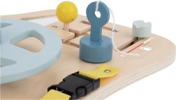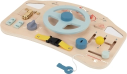 Deska pomaga otrokom pri izboljšanju finih motoričnih sposobnosti s pomočjo interaktivnih elementov, kot so volan, ročice in gumbi.